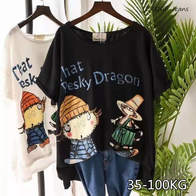 PKOGF夏季新款加大码女式T恤休闲宽松卡通印花图案加大码短袖上衣
